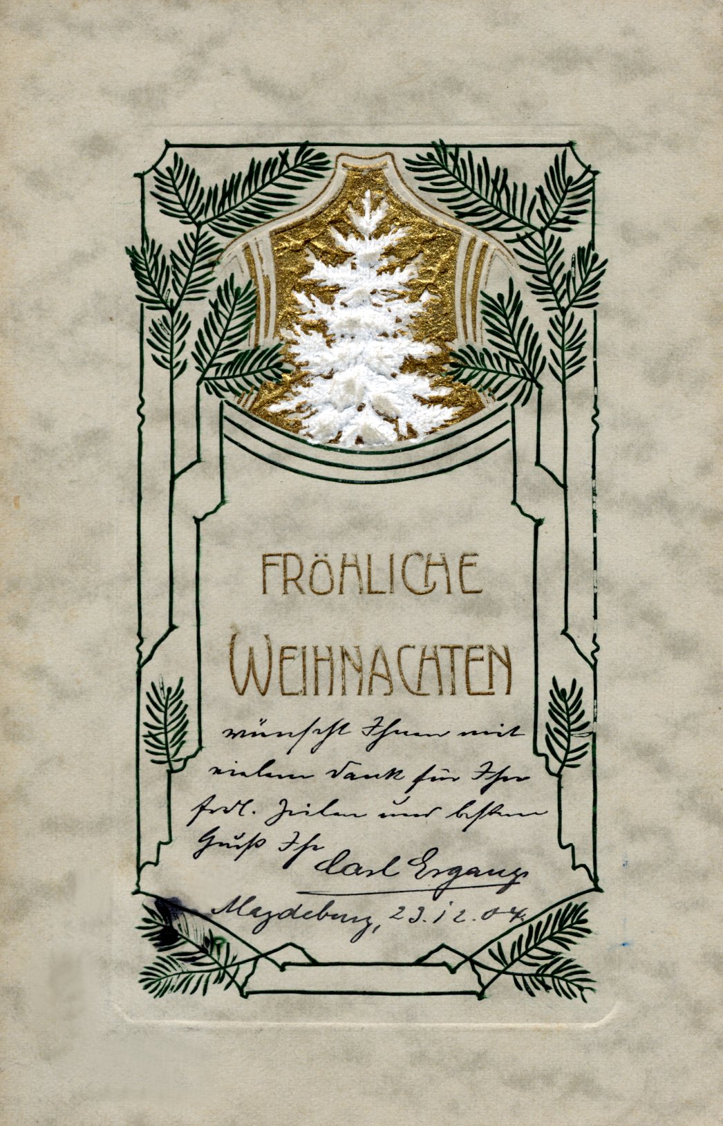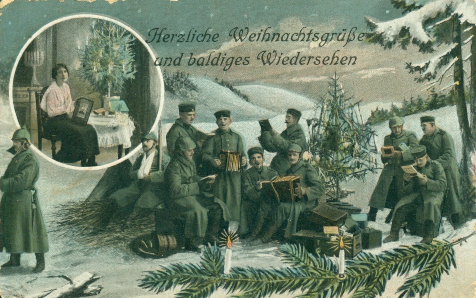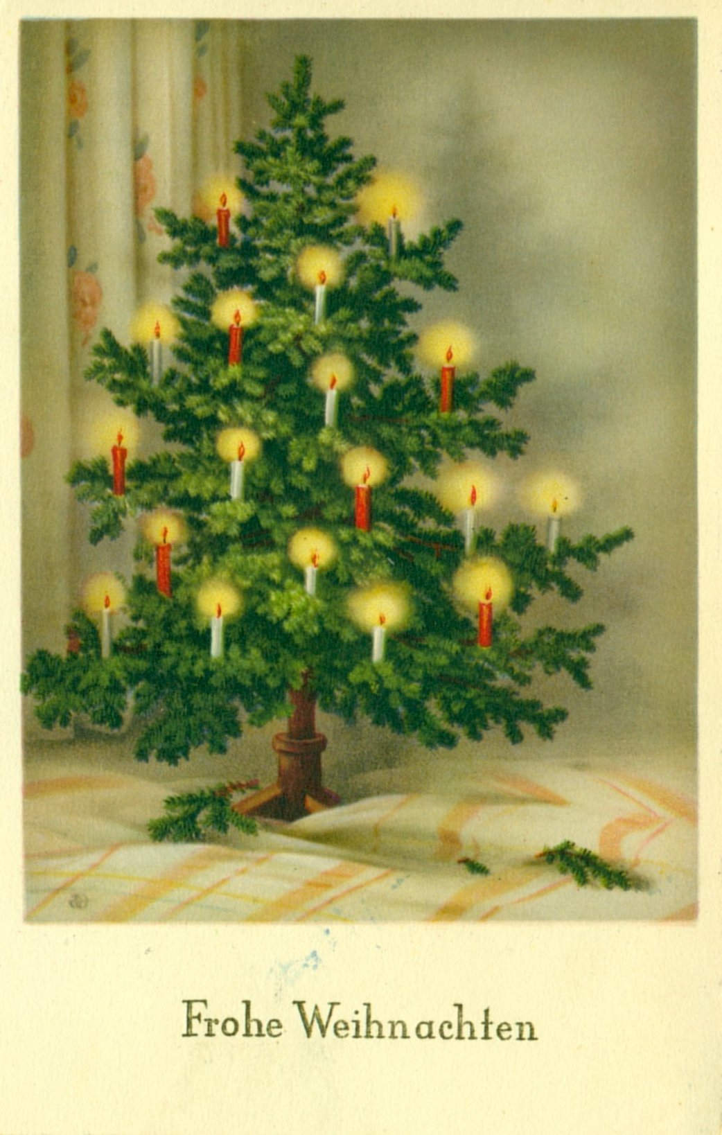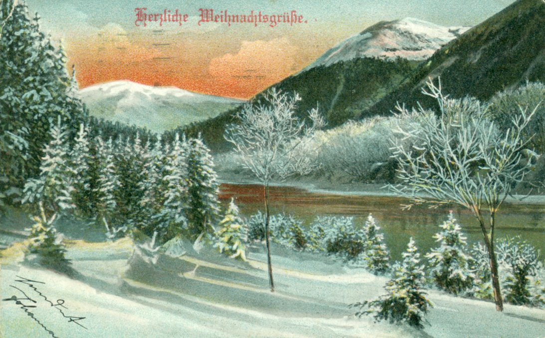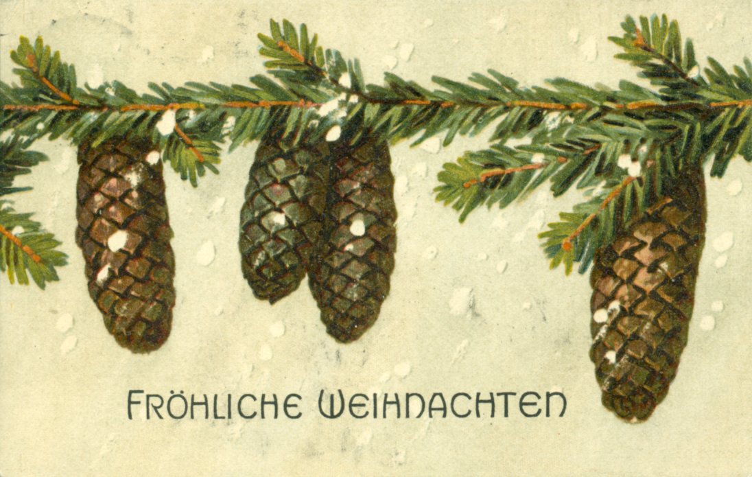 Die Motive variieren mit dem Zeitgeschmack. Im 19.Jahrhundert sind die Motive noch vom Biedermeier und dem Historismus geprägt, später dominiert längere Zeit der Jugendstil. Neben christlichen Motiven wie die Krippe (eher geringere Motivzahl), werden gerne Winterlandschaften, Weihnachtsbäume, Zweige mit Zapfen und Weihnachtsmänner dargestellt. Zu Kriegszeiten finden sich patriotische Motive mit Soldaten oder Reichskriegsflagge. Wir zeigen eine Auswahl von Weihnachtskarten der ersten Hälfte des 20.Jahrhunderts. In keiner anderen Zeit finden sich soviele verschiedene Motive. Heute lösen Emails, Ecards oder das Telefon die klassische Postkarte zunehmend ab.